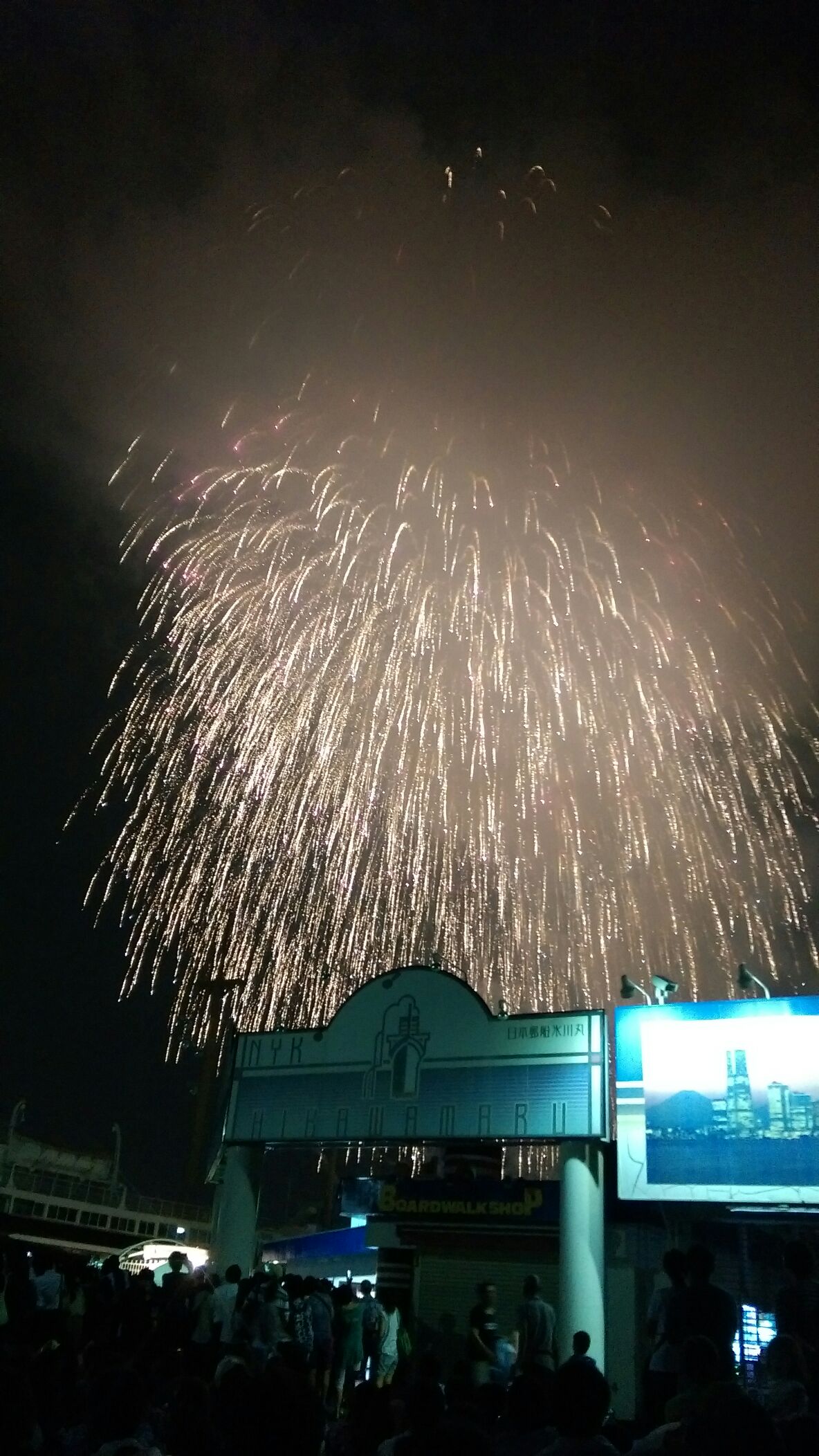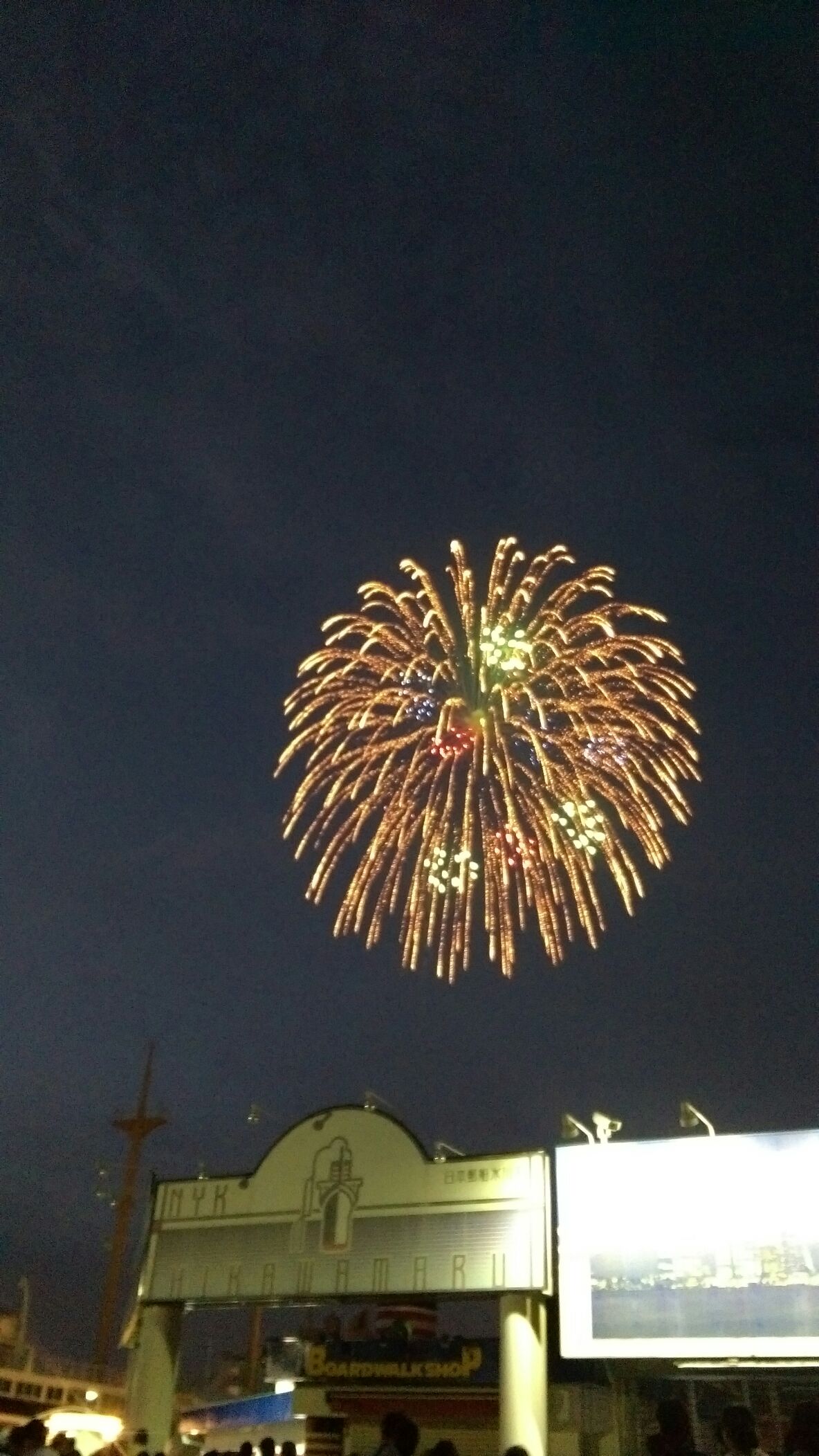 海面近くで展開されたスターマイン等の一部は見にくかったですが、空高く上がった花火は良く見えました。