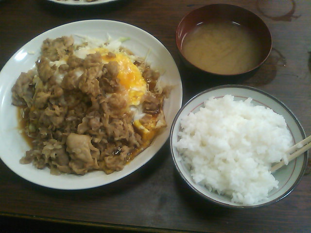 トンケイ定食という物で、豚肉の下に目玉焼きがあって、更にその下にキャベツが敷いてあります。
